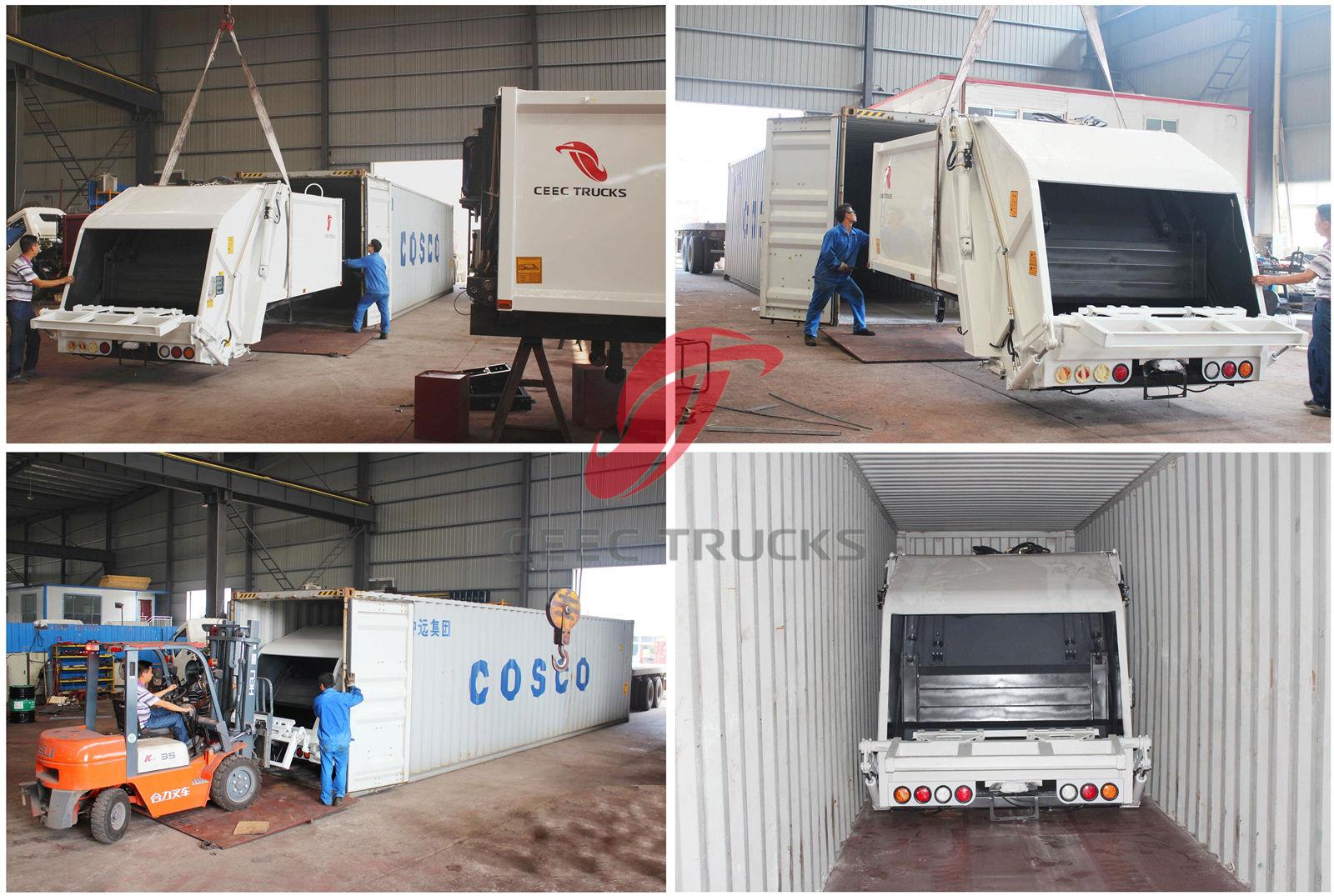 5 CBM, 7 CBM, 8 CBM çöp sıkıştırma kamyonunu konteynerle üretme ve gönderme konusunda harika bir deneyime sahibiz. Tüm 8 CBM çöp sıkıştırma kamyonlarını 40 HQ konteynere koymamız sadece 10 dakika sürüyor. Mühendislik departmanı ve üretim departmanının harika çalışması için teşekkürler, onlarla gurur duyuyoruz.