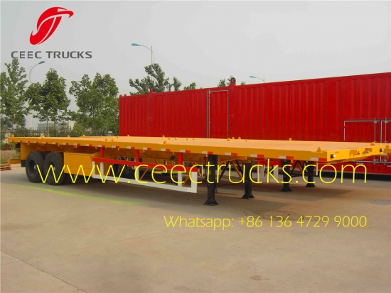 2 akslı 40 ft düz yataklı römork/bogieli platform konteyner taşıma yarı römorku, ağır tip bogie süspansiyonlu römork BPW aksı ve JOST kingpin ve iniş ayaklarını kullanır, çoğunlukla Kenya, Kongo, Tanzanya vb.'ye ihraç edilir