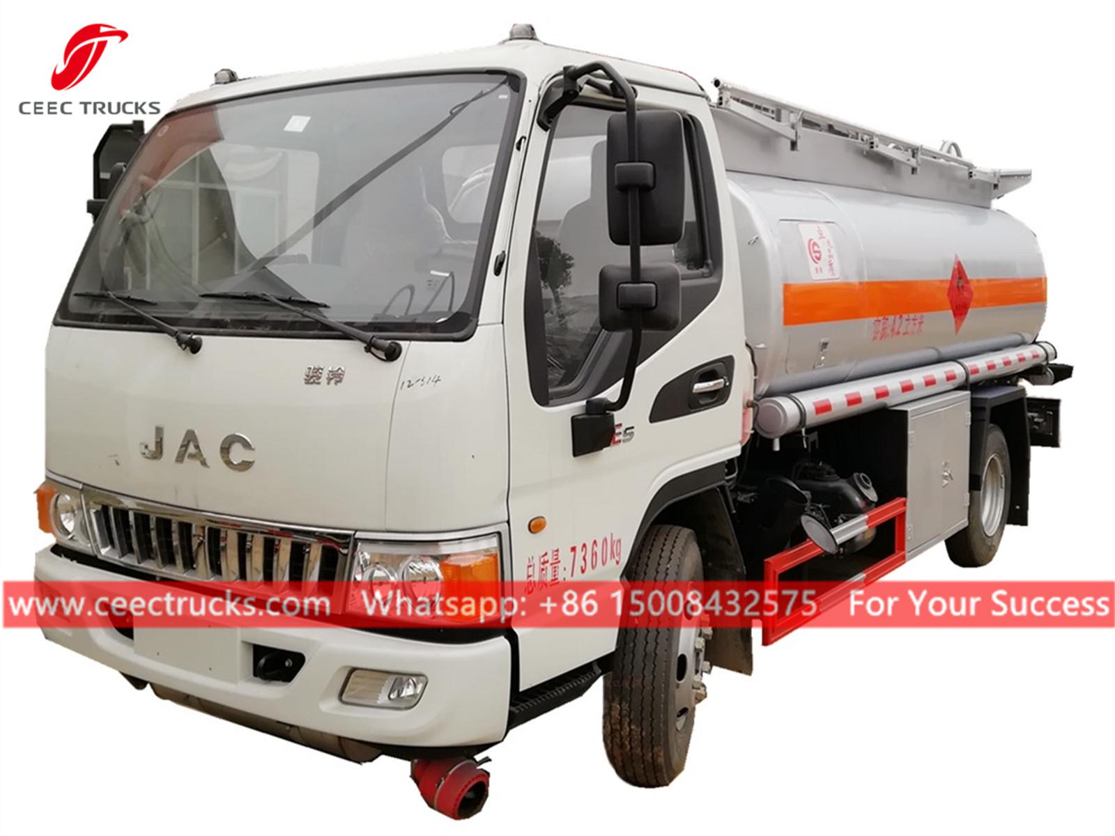 4.2cbm petrol tankeri kamyonu, JAC 4x2 şasi, WEICHAI 130HP dizel motor, standart yakıt tankeri, standart olarak ünlü marka yağ pompası. Tüm boyama ve logolar gereksinime bağlıdır.