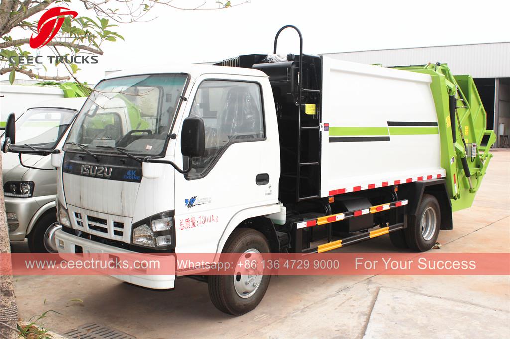 Philippine 5cbm garbage compactor truck for sale with best price, ISUZU 4x2 chassis, equipped with 120HP diesel engine, MSB 5-shift manual gearbox, PLC control box, painting and log s depend on requirement.