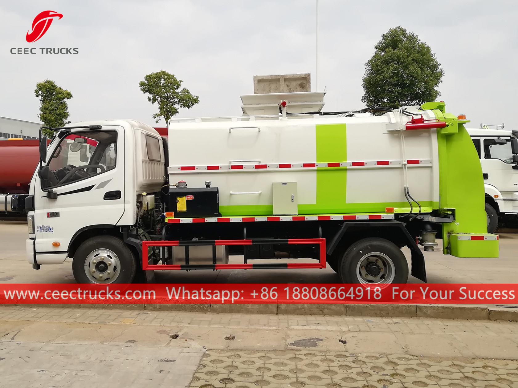 FOTON 6cbm Mutfak atık toplama kamyonu, FOTON 4x2 şase, manuel 5 vitesli manuel şanzıman, CUMMINS 142HP dizel motor, otomatik yan kaldırma tertibatı, hidrolik arka kapı ile donatılmış, boya ve logolar isteğe bağlıdır.