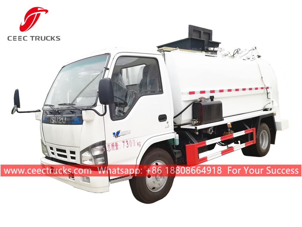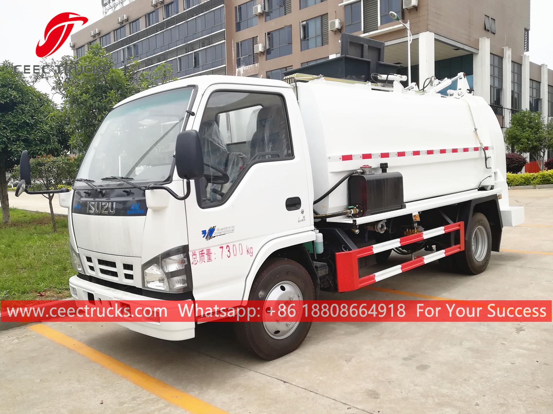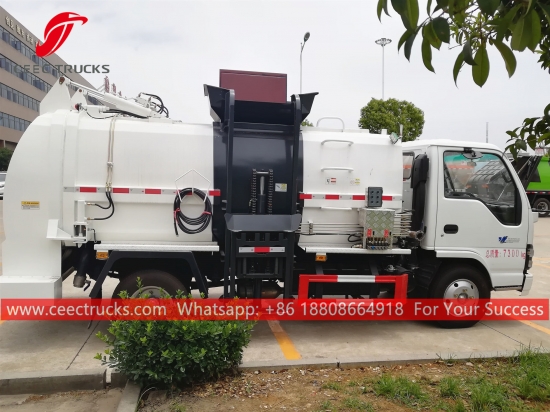 ISUZU 6cbm Mutfak atık toplama kamyonu, ISUZU 4x2 şasi, manuel 5 vitesli manuel şanzıman, ISUZU 130HP dizel motor, otomatik yan kaldırma tertibatı, hidrolik arka kapı ile donatılmış, boya ve logolar isteğe bağlıdır.