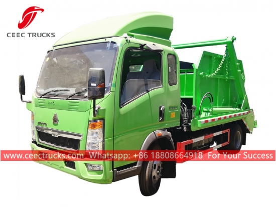 HOWO 6cbm skip yükleyici çöp kamyonu, HOWO 4x2 şasi, manuel 6 vitesli manuel şanzıman, 120HP dizel motor, yüksek mukavemetli çelik salıncak kolu sistemi, Hidrolik kontrol cihazı ve Elektrik kontrol kutusu opsiyonel. Tüm boyama ve logolar gereksinime bağlıdır.