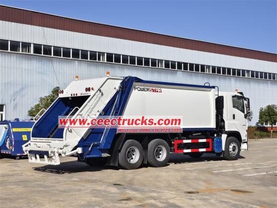 Isuzu VC61 6x4 cabin,large capacity garbage binBu Isuzu GIGA 6x4 ağır hizmet tipi çöp kamyonu, sanitasyon mühendisliği alanında olağanüstü bir çalışma ve kentsel temizlik için stratejik bir silahtır. 6UZ1-TCG61 motorla donatılmış olup, 380 beygir gücünde güçlü bir çıkışa, 9.839L deplasmana ve turboşarj ve ara soğutma teknolojisine sahiptir. Sadece güçlü olmakla kalmaz, aynı zamanda katı Euro 6 emisyon standartlarını da karşılar. 25 tonluk toplam ağırlık konfigürasyonu ve 12,7 tonluk yük kapasitesi, büyük ve orta ölçekli şehirlerin günlük çöp toplama ihtiyaçlarını tam olarak karşılayabilir.