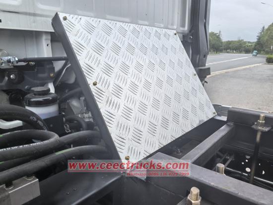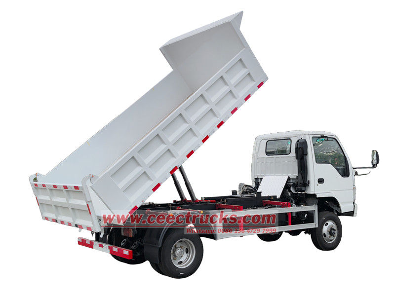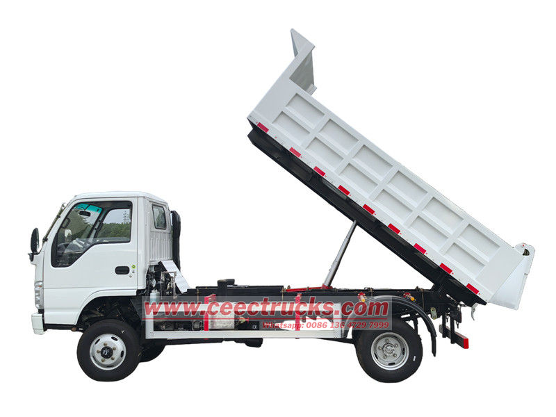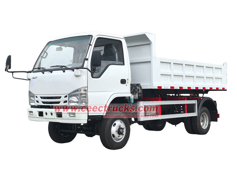 Isuzu 2 tonluk küçük damperli kamyon, 3360 mm dingil mesafesine sahip Isuzu ELF NKR şasisi temelinde modifiye edilmiş olup, Isuzu 120HP 4KH1CN6LB dizel motor, Isuzu MSB-5 vitesli şanzıman ve alt 4 mm, yan ve ön 3 mm.3550×2100×550 mm karbon çelikten yapılmış damperli kasa ile donatılmıştır, merkezi kaldırma, sabit kaldırma, temiz ve hızlı boşaltma, arka kapılar açılabilir ve araç, sürücü tarafındaki kullanımı kolay kontrol valfi ile kontrol edilir.