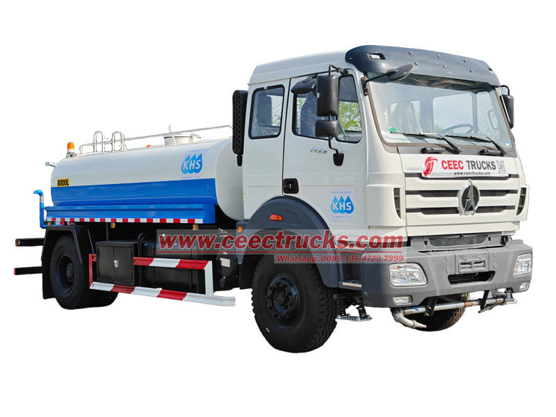 Beiben 10cbm su tankeri dağıtıcı kamyonu, yeni Beiben 1929 şasisi, WP10.290E32 motoru, sıralı 6 silindirli 4 zamanlı, maksimum 213 kW (290 hp) güç çıkışı, Fast 9JS150A şanzımanı üzerine modifiye edilmiştir, üst kısmı 10 metreküp karbon çelik su deposudur, ön su püskürtme nozulları, arka su püskürtme nozulları, su püskürtme monitörü ile donatılmıştır, tankın kuyruğu bir platformdur. Beiben 10cbm su tankeri dağıtıcı kamyonu, su sisi püskürterek toz ve kirliliği etkili bir şekilde azaltabilir, yol tozunu azaltabilir ve hava kalitesini iyileştirebilir.