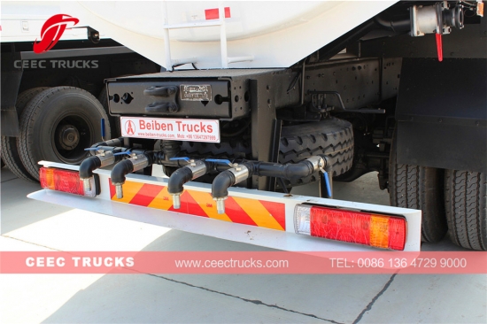 Beiben su kamyonu esas olarak şasi, tanklar, pompalar, vanalar ve su borusu, sprinkler ve diğer parçalardan oluşur. Su kamyonu yüksek kaliteli karbon çelik sacdan yapılmıştır.