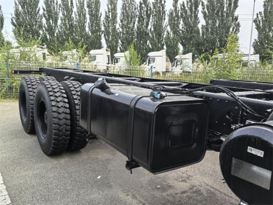Beiben 6x6 dört tekerlekten çekişli şasi, Beiben NG80 2638AP model kabini kullanıyor, dört tekerlekten çekişli, 4450+1450mm dingil mesafesine sahip, Weichai WP10.380E32 motor, Fast 9 ileri şanzıman, 7 tonluk ön aks, 18 tonluk arka çift aks, 12.00R20 lastikler ve 90km/s azami hız ile donatılmış.