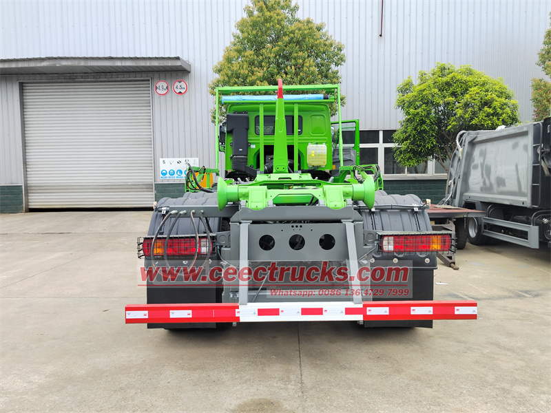 Kol yükleme ve boşaltma:Hooklift aracı, çöp bölmesini kolayca kaldırabilen, indirebilen ve boşaltabilen, çöp bölmesinin hızlı ve güvenli bir şekilde yüklenmesini ve boşaltılmasını sağlayan güçlü bir kol cihazı ile donatılmıştır.