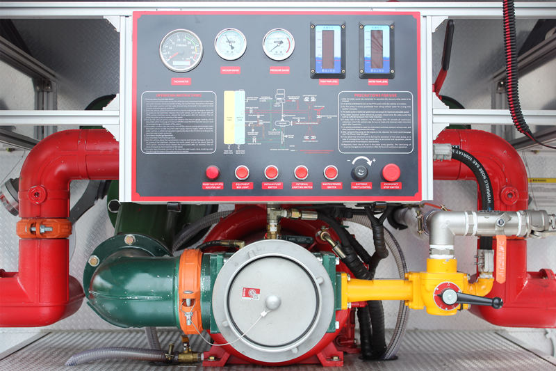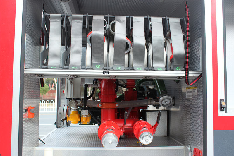 â–² Yangın pompası sistemi:Araç, yüksek performanslı CB10/60 yangın pompasıyla donatılmıştır60L/s'ye kadar nominal akış ve 1.232MPa'lık maksimum çalışma basıncı ile uzun mesafeli ve büyük akışlı su temini ihtiyaçlarını karşılar. Su pompası, güçlü kendi kendine emiş kabiliyeti ve kararlı çalışma ile iki aşamalı santrifüj tasarımını benimser. 7 metrelik emiş derinliği koşullarında hızla kararlı su basıncı oluşturabilir.