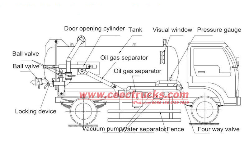 ● Atık su emme tanker gövdesi, tankın içinde yüksek vakum ve negatif basınç oluşturmak için bir vakum pompasını çalıştırarak çalışır ve bu da atık suyu, çamuru ve kirleri hızla tanka çeken güçlü bir emiş üretir.