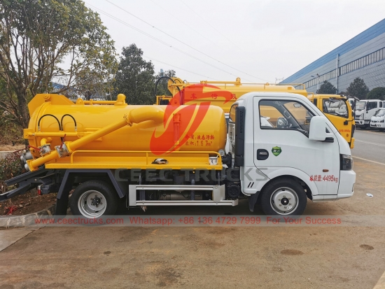 Dongfeng 2000L mini vakumlu tank kamyonu Afrika'ya ihraç ediliyor, QUANCHAI 95HP dizel motor, 5 vitesli manuel şanzıman, yüksek mukavemetli karbon çelik malzeme tankeri, kapasite 1 ila 3 metreküp olabilir. İsteğe bağlı yerli WEILONG vakum pompası ve ithal JUROP / BP / MORO vakum pompası, atık tahliyesi için hidrolik kaldırma cihazı, boyama ve logolar talebe bağlıdır.