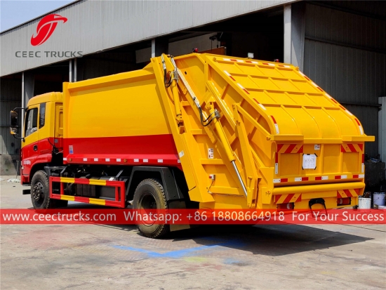 Dongfeng 12cbm çöp kompresör kamyonu, kamyon şasisi CUMMINS 180HP dizel motor, manuel 6 vitesli şanzıman dişlisi kullanır. Kolay kullanım için PLC kontrol kutusu. Tüm boyama ve logolar müşterinin gereksinimlerine göre yapılır.