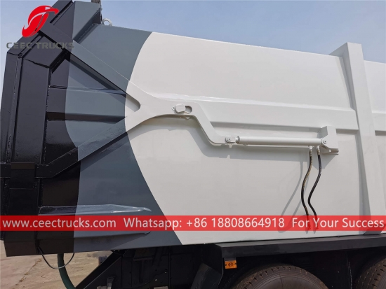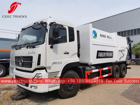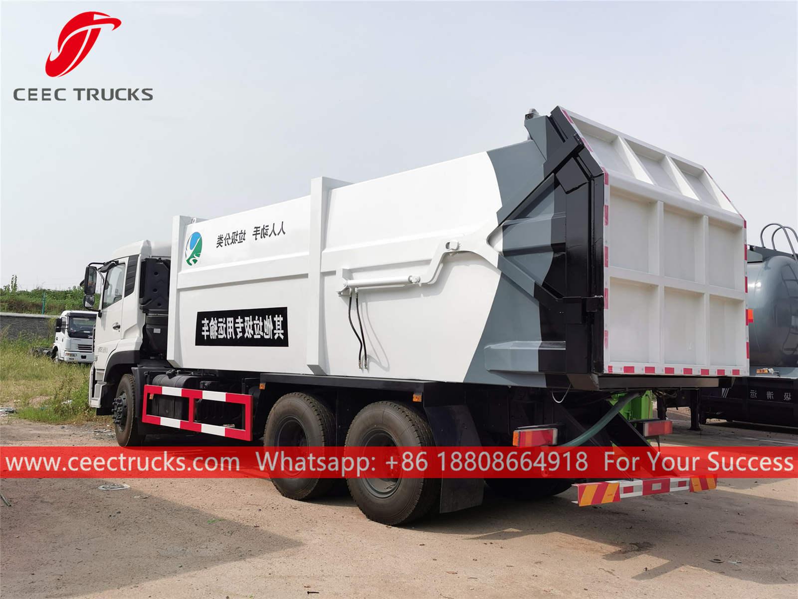 Dongfeng 18CBM çöp toplama kamyonu, Dongfeng LHD 6*4 şasi, CUMMINS 210HP dizel motor, 9 vitesli manuel şanzıman, kolay kullanım için hidrolik arka kapı kullanıyor. Tüm boyama ve logolar gereksinime bağlıdır.