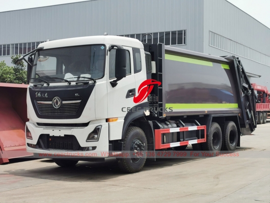 Dongfeng 20cbm arka yüklemeli kamyon, kamyon şasisi CUMMINS 290HP dizel motor, FAST 9-shift şanzıman dişlisi kullanır. Kolay kullanım için PLC kontrol kutusu. Tüm boyama ve logolar müşterinin gereksinimlerine göre yapılır.