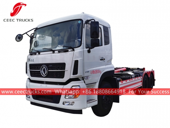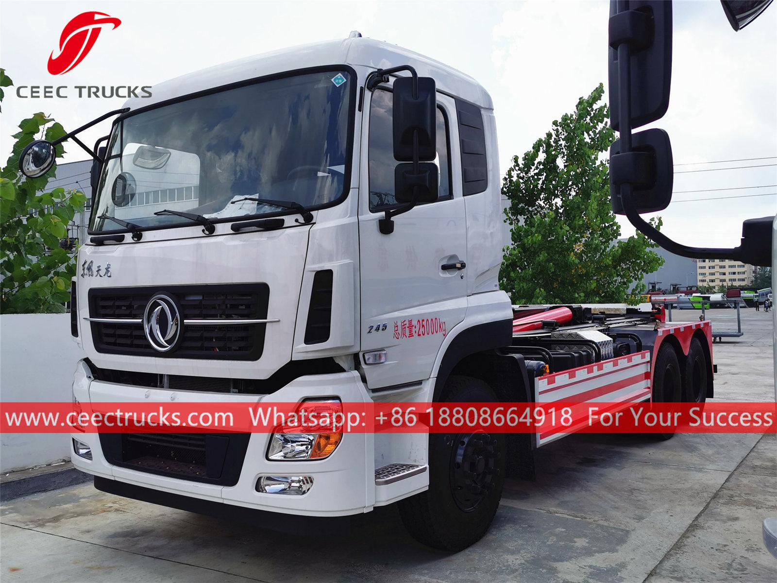 Dongfeng 20 Ton kancalı yükleyici çöp kamyonu, 270 HP dizel motorlu Dongfeng 6x4 şasi, manuel 8 vitesli manuel şanzıman, yüksek mukavemetli kancalı yükleyici sistemi, her türlü çöp konteyneri opsiyonel. Tüm boyama ve logolar gereksinime bağlıdır.