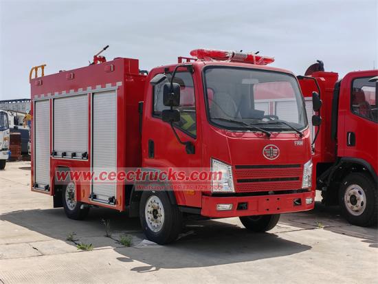 FAW 3 kübik itfaiye aracı, FAW TIGER VR şasesi temelinde modifiye edilmiştir, 3300 mm dingil mesafesi, XICHAI CA4DB1A13E6 130HP motor, 2.2L Euro 6 emisyon, WLY5G32C 5 vitesli şanzıman, üst kısım 2 kübik karbon çelik su tankı ve 1 kübik paslanmaz çelik köpük tankı ile donatılmıştır, CB10/40 yangın pompası, PL8/32 köpük su kombine yangın monitörü ile donatılmıştır, araç bir ekipman kutusu ile donatılmıştır, ekipman kutusu ve pompa odası sırasıyla yangın hortumu makarası, yangın hortumu, yangın baltası, kürek, kazma, anahtar, yangın söndürücü, su toplayıcı, su dağıtıcısı, su filtresi, yangın su tabancası, köpük tabancası, redüktör vb. dahil olmak üzere bir dizi yangınla mücadele ekipmanı ile donatılmıştır. Arka pompa odası, ilgili verileri (takometre, vakum göstergesi, basınç göstergesi, köpük seviye göstergesi, su seviye göstergesi vb.) ve bazı kontrolleri izleyebilen bir kontrol paneli ile donatılmıştır. düğme işlemlerinin (ışık, PTO düğmesi, acil stop düğmesi vb.) gerçek zamanlı olarak izlenmesi.