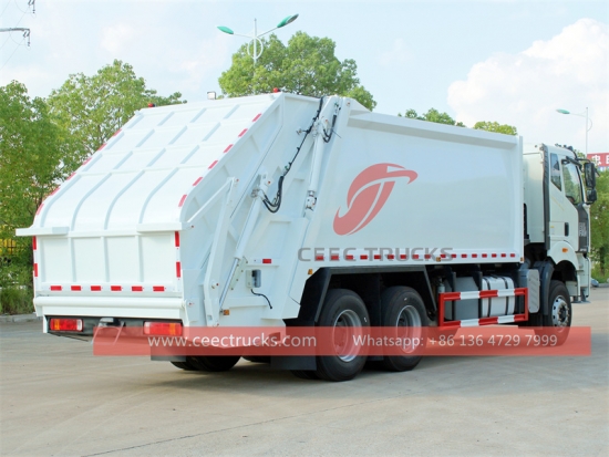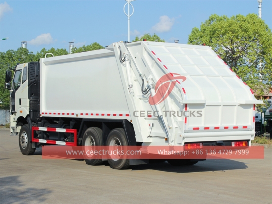 FAW 6x4 20cbm atık sıkıştırma kamyonu, FAW 6×4 soldan direksiyonlu ağır hizmet tipi kamyon şasisi, WEICHAI 350HP dizel motor, 10 vitesli şanzıman dişlisi ile donatılmıştır. Kolay kullanım için CAN-bus kontrol sistemi. Tüm boyama ve logolar müşterinin ihtiyacına göredir.