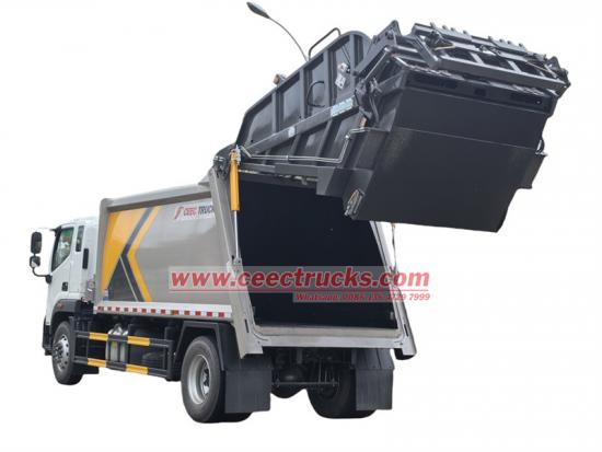 Rear tilting device for 360L and 1100L metal binsFOTON 16CBM çöp sıkıştırma kamyonu, 1086VLPHK-0FDA01 model 4x2 kamyon şasisi baz alınarak tasarlanmış süper güçlü bir atık yönetim ekipmanıdır. FOTON AUMAN arka yükleyici kamyon CUMMINS marka ISDe270 30 model 270HP dizel motorla donatılmış olup, güç sistemi turboşarj ve intercooler teknolojisi ile donatılmıştır, emisyon değeri 6700cc'dir, dağcılık için daha güçlü ve etkilidir. ZF 8 vitesli manuel şanzıman, ön aks 4.2 ton ve arka aks 9 ton, 295/80R22.5 lastiklerle donatılmış olup, güçlü bir yük taşıma kapasitesi sağlar. 16cbm sıkıştırıcı gövde ile monte edilmiştir, T420 malzemesinden eğrisel olarak şekillendirilmiştir, yanlar 4 mm ve taban 5 mm kalınlığındadır, güvenlik için çift yönlü balans valfi ve optoelektronik anahtar ile donatılmıştır, arka yatırma cihazı 360L ve 1100L çöp kutularını yüklemek için kullanılabilir, yerel çöp toplama ve topluluk ve fabrikalarda taşıma için uygundur. CAN BUS elektrik kontrol sistemi ve Hidrolik valf kontrol sistemi birlikte çalışarak FOTON 16000L atık yönetim aracını Şili Başkenti Santiago'da çok popüler ve güvenilir hale getirir.