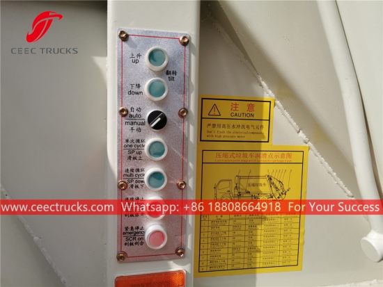 Yüksek mukavemetli çelik malzeme sıkıştırıcı gövde, ithal kontrol PLC modeli, hidrolik silindir kontrol cihazı ve kolay kullanım için İngilizce versiyon kontrol kutusu kullanan yeni tasarlanmış 8.000 litrelik arka yüklemeli atık kamyonu gövdesi.