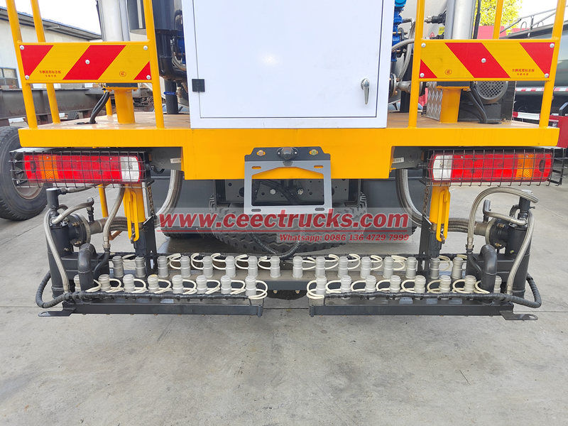 Aracın arka tarafında, yüksek basınçlı santrifüj pompa ve yelpaze biçimli nozul ile donatılmış, uzunluğu 2 ila 6 metre arasında ayarlanabilen geri çekilebilir bir püskürtme bomu bulunmaktadır. Püskürtme genişliği ve akış hızı, penetrasyon kaplama, yapışkan kaplama ve sızdırmazlık kaplama gibi farklı proseslerin gereksinimlerini karşılamak için araç bilgisayarı üzerinden kademesiz olarak (0,3 ila 3 L/m²) ayarlanabilir.