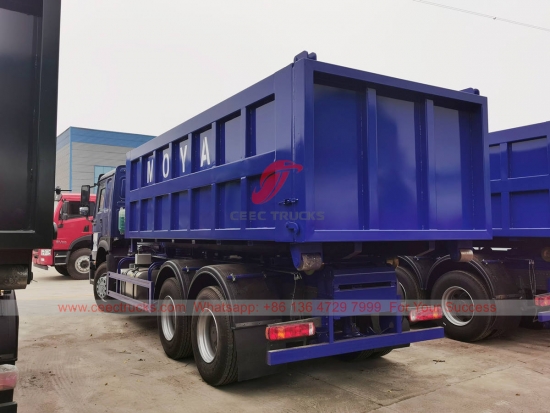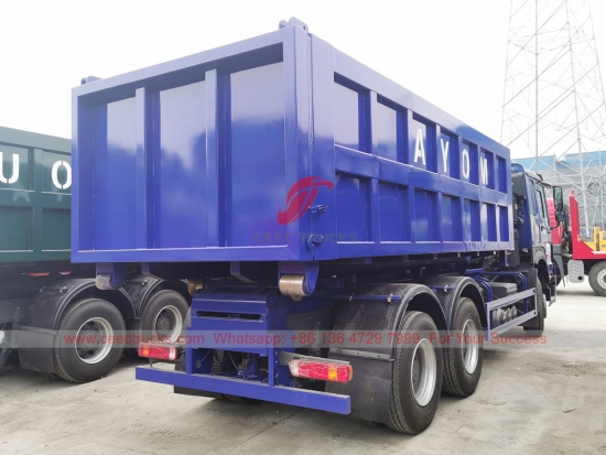 HOWO 20 cbm kancalı kaldırma çöp kamyonu, WEICHAI 336HP dizel motorlu HOWO 6x4 RHD model şasi, 10 vitesli manuel şanzıman, yüksek mukavemetli kancalı yükleyici sistemi, her türlü çöp konteyneri opsiyonel. Boyama ve logolar gereksinime bağlıdır.