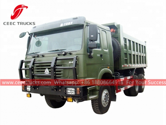 Çin HOWO 6×6 damperli kamyon, HOWO 6x6 LHD şasi, SINOTRUK 10 vitesli manuel şanzıman, ünlü Çin markası SINOTRUK 336HP dizel motor, yüksek mukavemetli çelik damperli gövde, isteğe bağlı HYVA veya yerli hidrolik kaldırıcı. Tüm boyama ve logolar gereksinime bağlıdır.