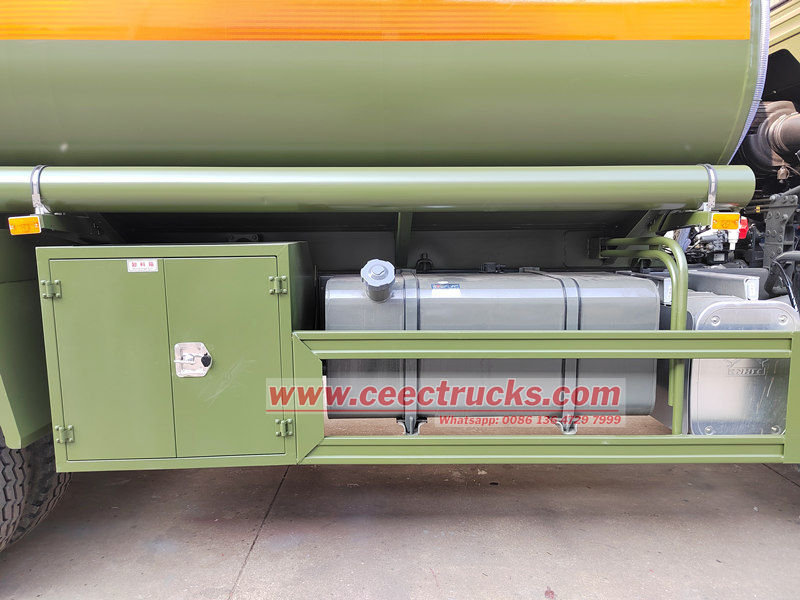 HOWO 6x6 askeri mobil yakıt dağıtım kamyonu, 400hp WP12.400E22 dizel motor ve HW19710 şanzımanla donatılmış HOWO 6x6 şasisine dayanmaktadır, 12.00R20 lastik ve güçlü ve kullanımı kolay ZF8118 direksiyon dişlisiyle donatılmıştır. İster bir şantiye, ister uzak yol, havaalanı veya maden olsun, yakıt ikmal kamyonu esnek bir şekilde gelebilir, ekipmanı zamanında yakıt ikmali yapabilir ve üretimin ve yaşamın normal çalışmasını sağlayabilir.