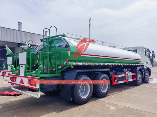 SINOTRUK HOWO 8x4 Water tanker truck (also called HOWO water tanker trucks, 12 wheels water delivery truck, HOWO Water bowser) is used for transporting and delivering large quantities of water to various locations and use low-level water flow to wash the dust on the road,and bring it down into the drainage pipe to achieve a clean and cooling effect.