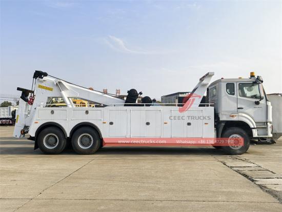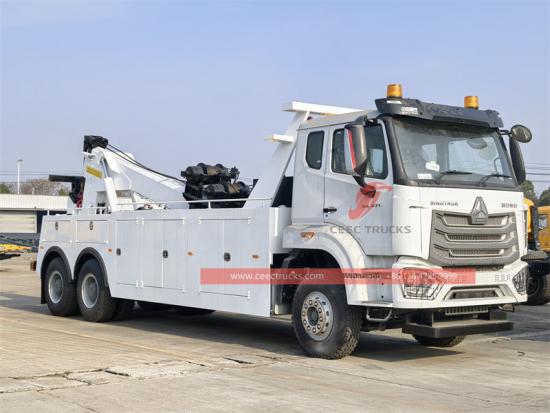Bu ağır duty wrecker, built by CEEC Trucks Group, utilizes the Howo NX cabin 6 x 4 drive chassis and is equipped with a powerful Howo WP10.340E22 diesel engine (3 4 0 HP /1250N . m of torque) and an HW1 9710 10 -speed transmission. Combined with an HF9-ton front axle and HC16-ton rear axle, it ensures exceptional power, load-bearing capacity, and reliability. It incorporates two 1 2 ton s hydraulic winches, resulting in an impressive rated towing capacity of 30 tons, making it ideal for handling accidents involving large trucks, buses, and construction machinery.