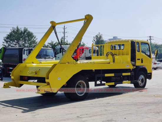 HOWO atlamalı yük çöp toplama kamyonu, HOWO 4x2 RHD şasi, 6 vitesli manuel şanzıman, YUNNEI 116HP dizel motor, yüksek mukavemetli çelik salıncak kolu sistemi, Hidrolik kontrol cihazı ve Elektrik kontrol kutusu isteğe bağlı. Tüm boyama ve logolar gereksinime bağlıdır.