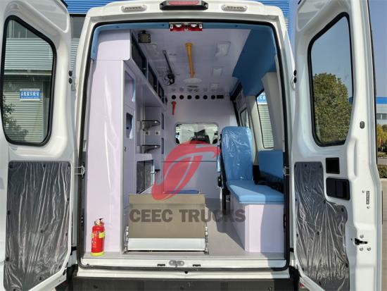 2. Gelişmiş tıbbi ekipman ve insancıl tasarım:Tıbbi kabinin iç kısmı kapsamlı ve gelişmiş ilk yardım ekipmanlarıyla donatılmıştır. Otomatik yüklemeli sedye sistemi sadece hastaların transferini kolaylaştırmakla kalmaz, aynı zamanda tıbbi personelin fiziksel yükünü de azaltır. Bağımsız olarak kontrol edilen klima ve ısıtma sistemleri hastalar ve tıbbi personel için konforlu bir ortam sağlarken, UV dezenfeksiyon lambası ve havalandırma sistemi hijyenik güvenliği garanti eder. Ayrıca, tıbbi kabin komple bir oksijen tedarik sistemi, infüzyon standı ve 1000W invertör ve diğer ekipmanlarla donatılmıştır ve çeşitli acil tıbbi tedaviler için güçlü destek sağlar. Bu tasarımlar, tıbbi ihtiyaçların derinlemesine anlaşılmasını tam olarak yansıtır ve ambulansı sadece bir ulaşım aracı değil, aynı zamanda mobil bir ilk yardım istasyonu haline getirir.