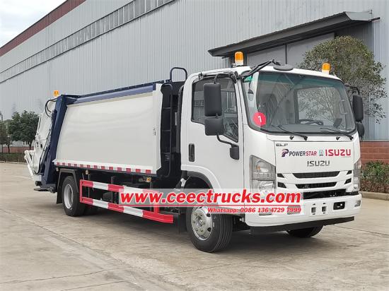 Isuzu rear loader truck with a flip mechanismIsuzu 700P damperli sıkıştırma kamyonuIsuzu NPR 700P şasesi üzerine modifiye edilen, 4175mm dingil mesafesi, A/C, USB, yön yardım sistemi, 4HK1-TCG61 motor, 5193ml EURO 6 emisyon, Isuzu MLD 6 ileri şanzıman ile donatılan araç, 10cbm karbon çelik çöp kutusu, dört kenarı ve beş tabanı kalınlığı, üst düzey Çin marka hidrolik silindirlere sahip yay şeklindeki sıkıştırıcı gövde, ters çevrilebilen kuyruk kısmı çevirme mekanizması olan, 240L, 360L, 660L, 770L çöp kutularını asabilen, kolay kullanım için CAN-BUS elektrik kontrol sistemine sahip.