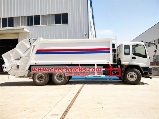 Thve Isuzu ağır hizmet tipi 16cbm kompresörlü çöp kamyonu, mükemmel performansa sahip bir kentsel temizlik aracıdır. Isuzu klasik kabinini benimser2 koltuklar ve 1 uyku yeri, sürücüye konforlu bir sürüş ortamı sağlamak için USB arayüzlü radyo ve klima ile donatılmıştır.kamyon 95km/s maksimum hıza ulaşabilir. Güç açısından,kamyon 7790 ml hacimli ve 300 beygir gücüne kadar çıkabilen Isuzu 6HK1-TCH motoruyla donatılmıştırHPIsuzu FVZ çöp sıkıştırma kamyonunun biçinde 16 metreküp hacme, 4 mm yan panel kalınlığına ve 5 mm alt panel kalınlığına sahiptir. Karbon çelik ve yüksek mukavemetli çelikten yapılmıştır. Çöp biçinde 4mm yüksek mukavemetli T420 çelikten yapılmıştır ve iç ve dış pas önleyici işlemden geçirilmiştir. Arka çöp kutusu 1,8-2,2 metreküp kapasiteye sahiptir ve 200+200 litrelik bir kanalizasyon tankı ile donatılmıştır. Çöp kutusu standart bir ark tasarımına sahiptir.