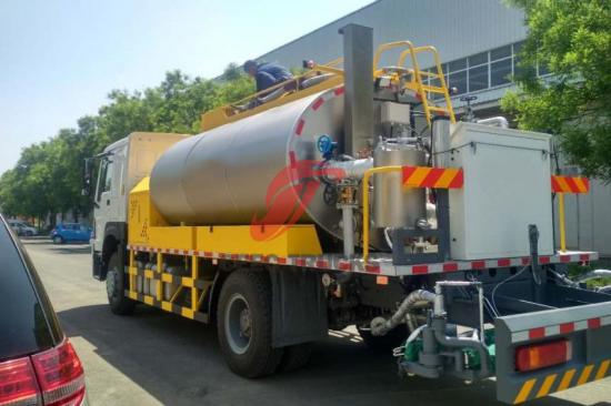 Akıllı asfalt dağıtım kamyonu; araç şasesi, asfalt tankı, asfalt pompalama ve püskürtme sistemi, termal yağ ısıtma sistemi, hidrolik sistem, yanma sistemi, kontrol sistemi, pnömatik sistem ve çalışma platformundan oluşuyor. |