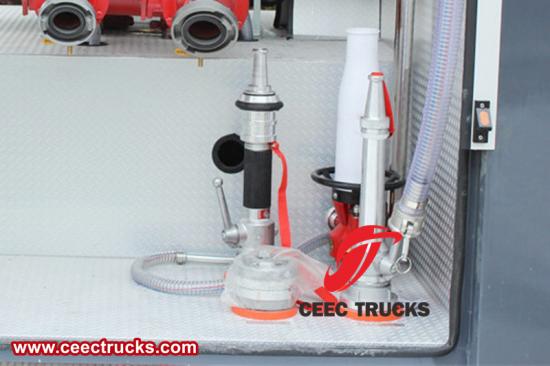 Isuzu FVZ 12000L köpük pompalı itfaiye aracı, itfaiyecilerin yangınlarla etkili ve verimli bir şekilde mücadele edebilmeleri için çeşitli yangın söndürme teçhizatı ve ekipmanlarıyla donatılmıştır. Araçtaki çeşitli yangın söndürme ekipmanlarının açıklaması aşağıdadır: