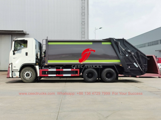 ISUZU 20cbm atık sıkıştırma kamyonu, kamyon şasisi ISUZU 300HP dizel motor, FAST 9-shift şanzıman dişlisi kullanır. Kolay kullanım için PLC kontrol kutusu. Tüm boyama ve logolar müşterinin gereksinimlerine göre yapılır.