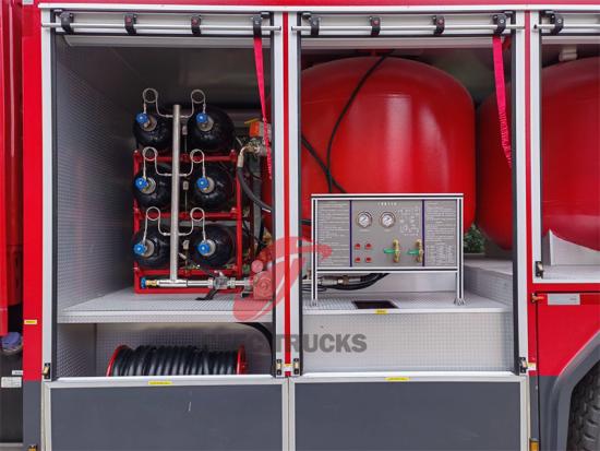 4000L dry powder tankIsuzu GIGA kuru toz/azotlu itfaiye aracı, önemli yerlerdeki yangınlarda kilit rol oynayan etkili ve çok yönlü bir yangın söndürme ekipmanıdır. Kuru toz/azot tanklı Isuzu GIGA 6x4 itfaiye aracı, kuru toz ve azot olmak üzere iki yangın söndürme ortamını birleştirir ve yangın söndürme prensibi oldukça kapsamlıdır. Kuru toz, yüksek sıcaklıkta eriyerek yanan nesnenin yüzeyini kaplayan ince bir film oluşturur, oksijeni izole eder ve böylece yanmayı engeller. Sodyum bikarbonat gibi bazı kuru tozlar yüksek sıcaklıklarda ayrışarak serbest radikalleri serbest bırakır ve yanmanın zincirleme reaksiyonuna müdahale eder. İnert bir gaz olan azot, boğulma ve yangını söndürme amacına ulaşmak için havadaki oksijen konsantrasyonunu seyreltebilir. Ayrıca, azot ve kuru toz püskürtüldüğünde ısıyı emer, yanan nesnenin sıcaklığını düşürür ve soğutma rolü oynar.