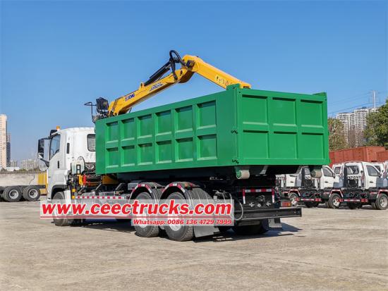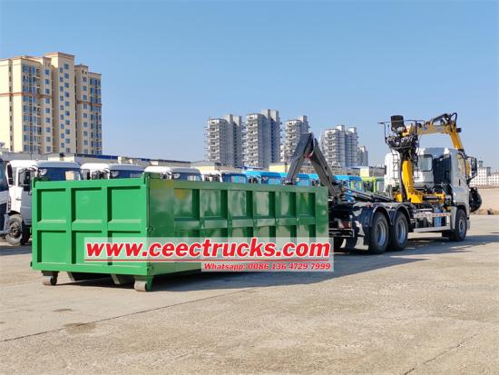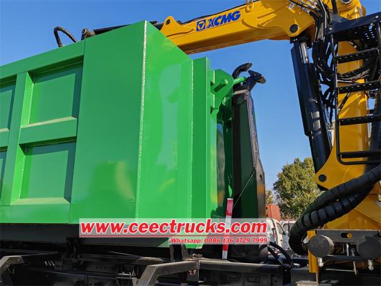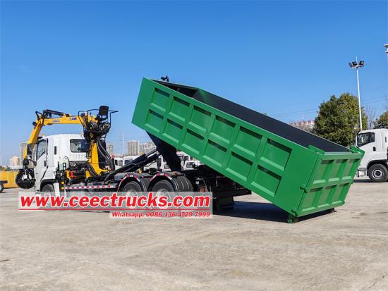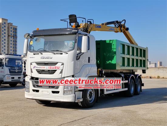 Konteynerli Isuzu ağır hizmet tipi kancalı kaldırma kamyonu, ağır yükleri kavramak ve kaldırmak için kullanılan katlanır kollu vinçli bir Isuzu kancalı kollu damperli kamyondur. Vincin kuyruğu kırık çelik bir tutucudur. Vinç, maksimum kaldırma ağırlığı 18 ton, maksimum kaldırma momenti 12tâ–ªm olan XCMG LQS120 yükleyici vinçtir. Araç, 6UZ1-TCG61 380HP motor, FAST 12 vitesli şanzımanla donatılmış Isuzu VC61 6X4 şasisi üzerine modifiye edilmiştir ve damperli kamyon boyutu 8200*2300*1200mm'dir, 6 yan ve 8 tabana sahiptir.
