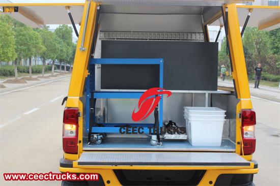 Isuzu 4x4 Pickup mobil atölye kamyonu, güçlü bir arazi stili gösteren sert gövde hatları ve geniş tekerlek yuvası tasarımına sahiptir. Gövde, yüksek mukavemetli çelikten yapılmıştır ve mükemmel burulma ve çarpışma önleme performansına sahiptir ve zorlu ortamlarda güvenli bir şekilde çalışmasını sağlar. Benzersiz kargo kutusu tasarımı, farklı servis ihtiyaçlarına göre çeşitli araç ve ekipmanları esnek bir şekilde yapılandırabilir ve basit bakım işlemlerinden karmaşık teknik desteğe kadar tam kapsama ulaşabilir.