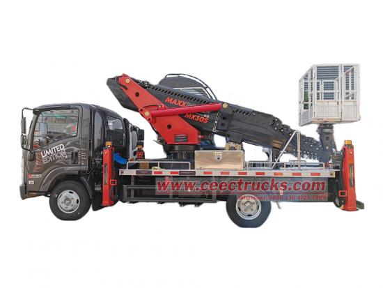 Isuzu KV100 30m hava çalışma aracı, Isuzu KV100 şasesi, 3815mm dingil mesafesi, 8280kg toplam kütle temelinde modifiye edilmiş olup, Isuzu 4KH1CN6HB 132HP Euro VI motor, Isuzu MLD 6 vitesli şanzıman ile donatılmıştır, üst kısmı 8 bölümlü 18 taraflı senkron teleskopik koldur, maksimum kaldırma yüksekliği 30 metredir, maksimum çalışma yarıçapı 12 metredir, tüm araç dört hidrolik teleskopik ayak (yukarı ve aşağı teleskopik ve yatay teleskopik) ve toplam sekiz silindir ile donatılmıştır, ön X tipi, arka H tipi, ayrı ayrı ayarlanabilir, acil durum pompası, çalışma platformunun 360 derece dönmesi, alüminyum alaşımlı çit, desenli kaymayı önleyici yürüyüş yolu, 200KG kova nominal yükü, döner tabla kabini, yer kontrol kutusu ile çalıştırılabilir, kablosuz uzaktan kumanda.